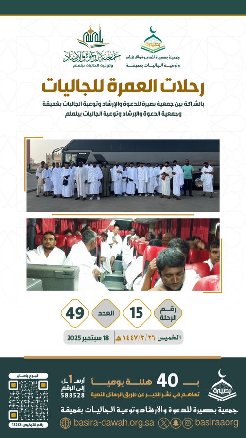 رحلات العمرة للجاليات التي تنظمها جمعية بصيرة للدعوة والإرشاد وتوعية الجاليات بغميقة وذلك بالشراكة مع جمعية الدعوة والإرشاد وتوعية الجاليات بيلملم